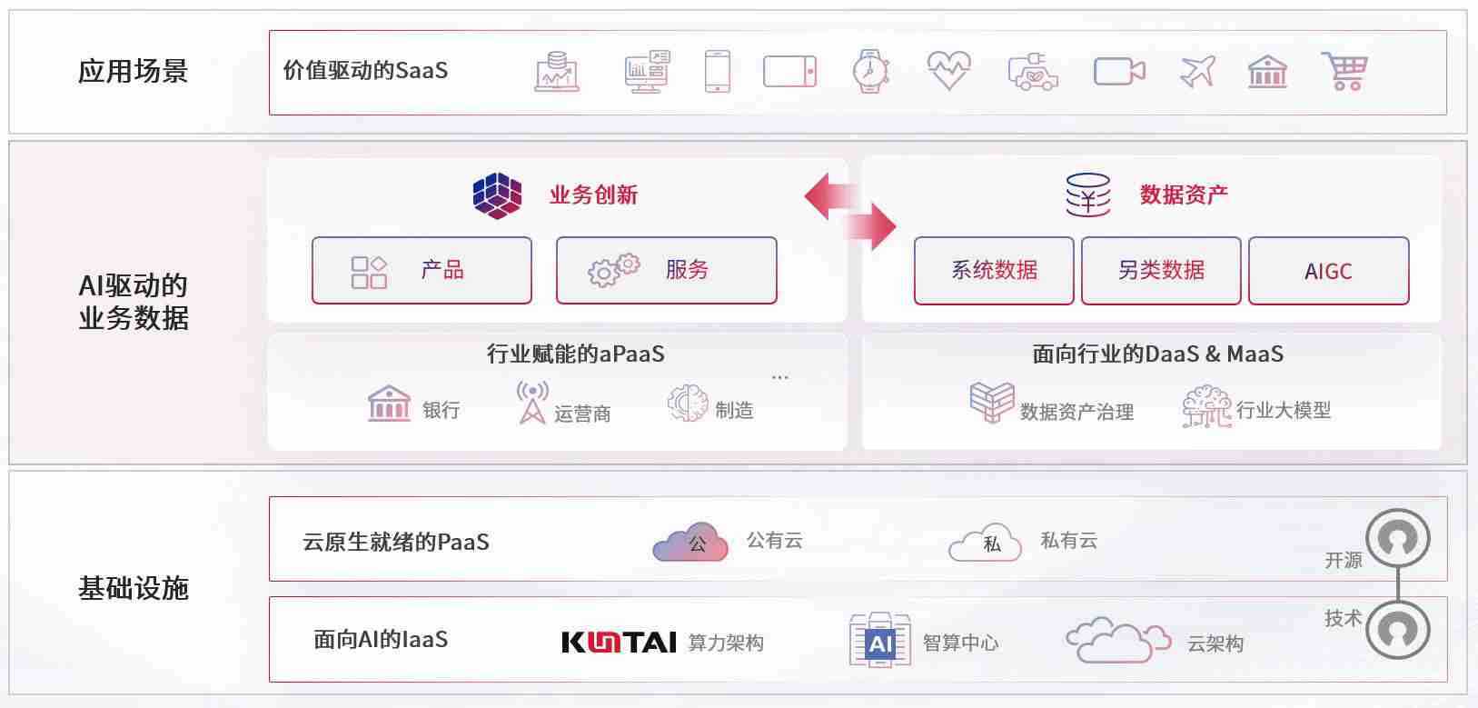 数字时代,,,,围绕企业数字化转型的关键要素,,壹号娱乐数码开创性的提出数云融合战略和技术体系框架,,着力在云原生、、数字原生、、、AI原生和信创产业上架构产品和服务能力,,,,为处在不同数字化转型阶段的快消零售、、汽车、、、金融、、、、医疗、、、、政企、、、教育、、、运营商等行业客户提供泛在的敏捷IT能力和融合的数据驱动能力,,构建跨界融合创新的数字业务场景和新业务模式,,助力企业级客户建立面向未来的核心能力和竞争优势,,全面推动社会的数字化、、、、智能化转型升级。。。。