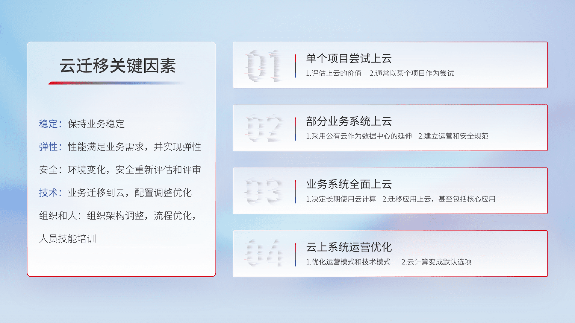 结合实际业务,,从规划设计、、、云平台选型、、、、云原生改造、、、、数据迁移、、、、集成交付,,,迁移全过程为客户识别最佳上云路径,,做好风险识别管理,,,,设计网络架构、、、、身份权限、、安全审计合规、、、操作审计、、、日志审计、、监控告警策略、、、、多站点容灾设计等,,对云上基础设施进行整体规划,,提升IT治理水平,,以满足弹性、、、高可用、、、、高性能的需求。。