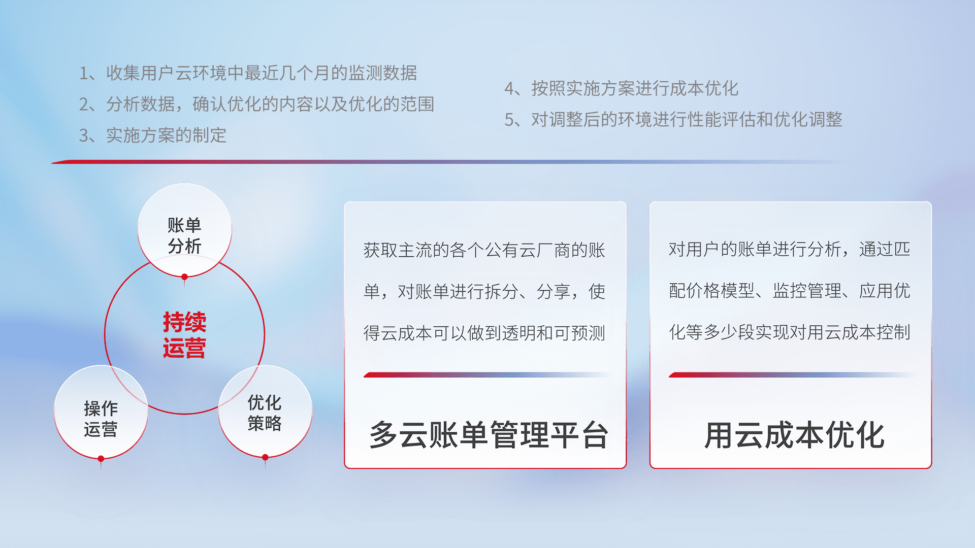 通过多云纳管,,以统一的资源数据模型把客户的云资源进行抽象和封装,,,,进而实现对多云资源的统一操作,,,保障云资源管理的可靠性、、稳定性与可用性。。。。量身定制化运维内容,,配置、、开发运维、、补丁管理、、、备份、、监控、、、、认证和访问管理、、、审计和日常巡检等,,,保障在用云过程中的可靠度,,稳定度以及高可用率。。