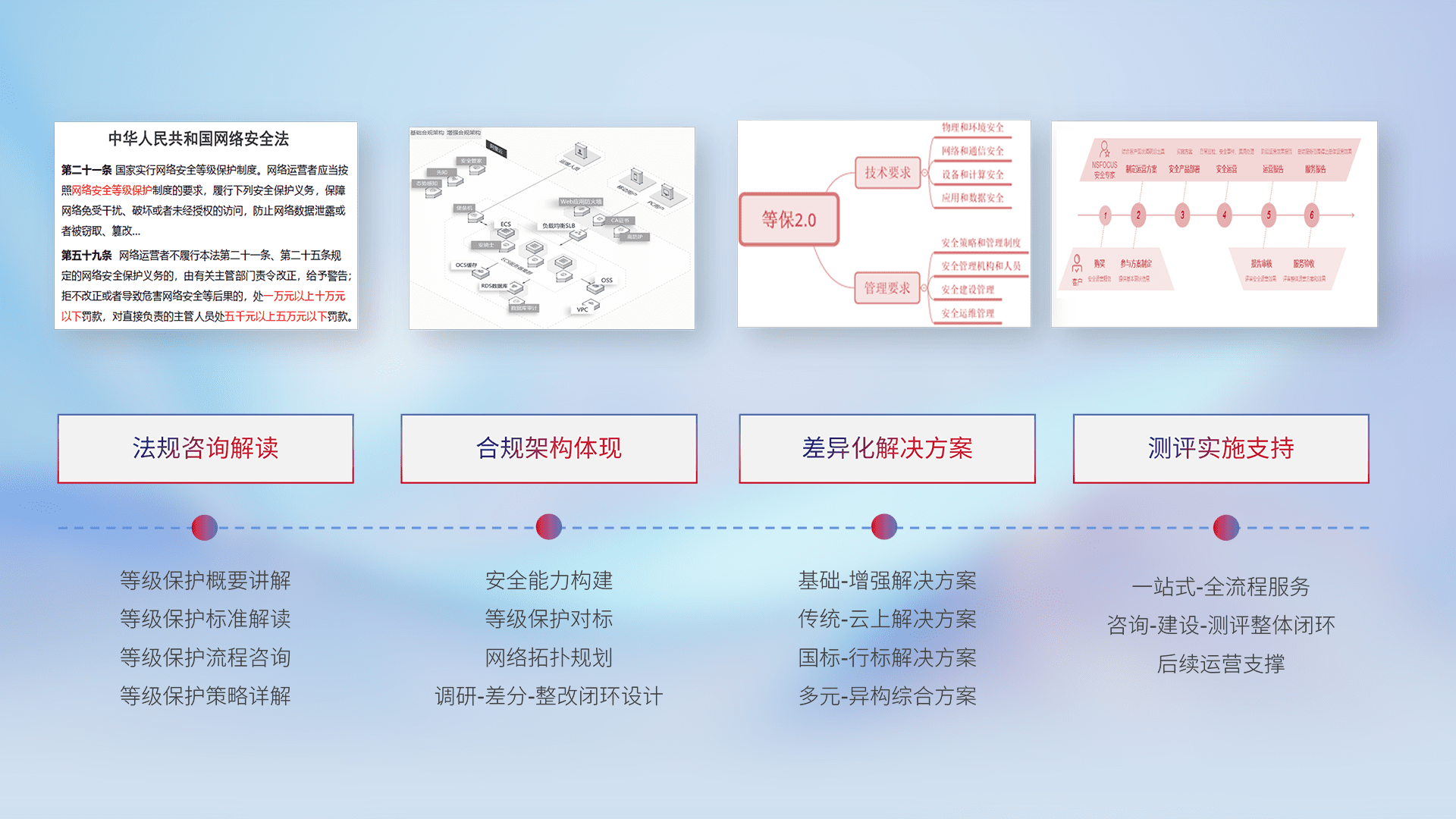 通过专业的法律咨询解读、、、、合规架构体现、、、、差异化解决方案、、、、测试实施支持等服务,,,,为客户量身打造等保合规体系。。。